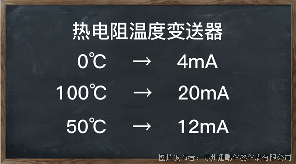 现在我手里拿的就是一只热电阻温度变送器,我们可以看出,它接收的是Pt100传感器信号,温度范围0-100℃,输出信号4~20mA,输出4~20mA与温度范围成线性关系,也就是说当温度为0℃时,其输出为4mA,当温度为100℃时,输出为20mA,当温度为50℃时,输出则为12mA;