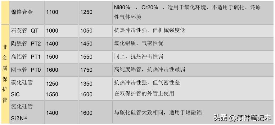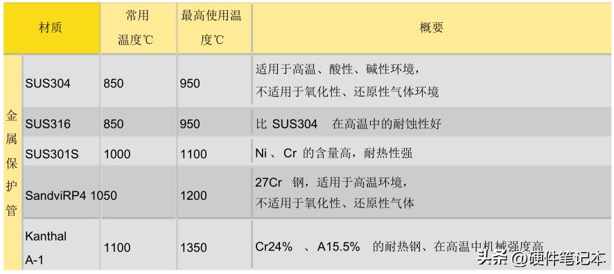 带保护管的热电偶是将热电偶的芯线以及绝缘管插入保护管使用的热电偶。保护管在防止芯线氧化、腐蚀的同时,还可以保持热电偶的机械强度。保护管有多种类型,常用的如下表所示。