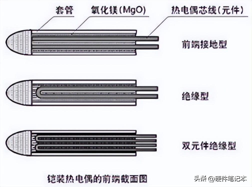 铠装热电偶的测量原理与带保护管的热电偶相同。它使用纤细的金属管 ( 称为套管)作为上图中绝缘管 (陶瓷) 的替代品,并使用氧化镁 (MgO)等粉末作为绝缘材料。